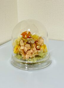 7月8月は生花が傷みやすいので毎年ドライフラワーやプリザーブドフラワーを使ったものを作成します。今月はドームフラワー!ビタミンカラーで素敵ですね! 大船のフラワーアレンジメント教室