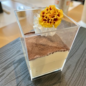とあるスタジアムの特別観覧席でサッカー観戦をしました。デザートのティラミスにマリーゴールドが添えてあり、嬉しくなりました。お花のちからですね!