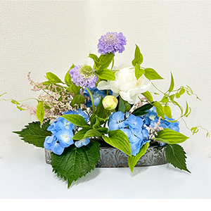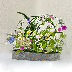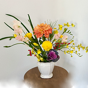 季節のお花を使いテーマを決めてアレンジメントの基本形や黄金比を取り入れながら自由な雰囲気で行っています。